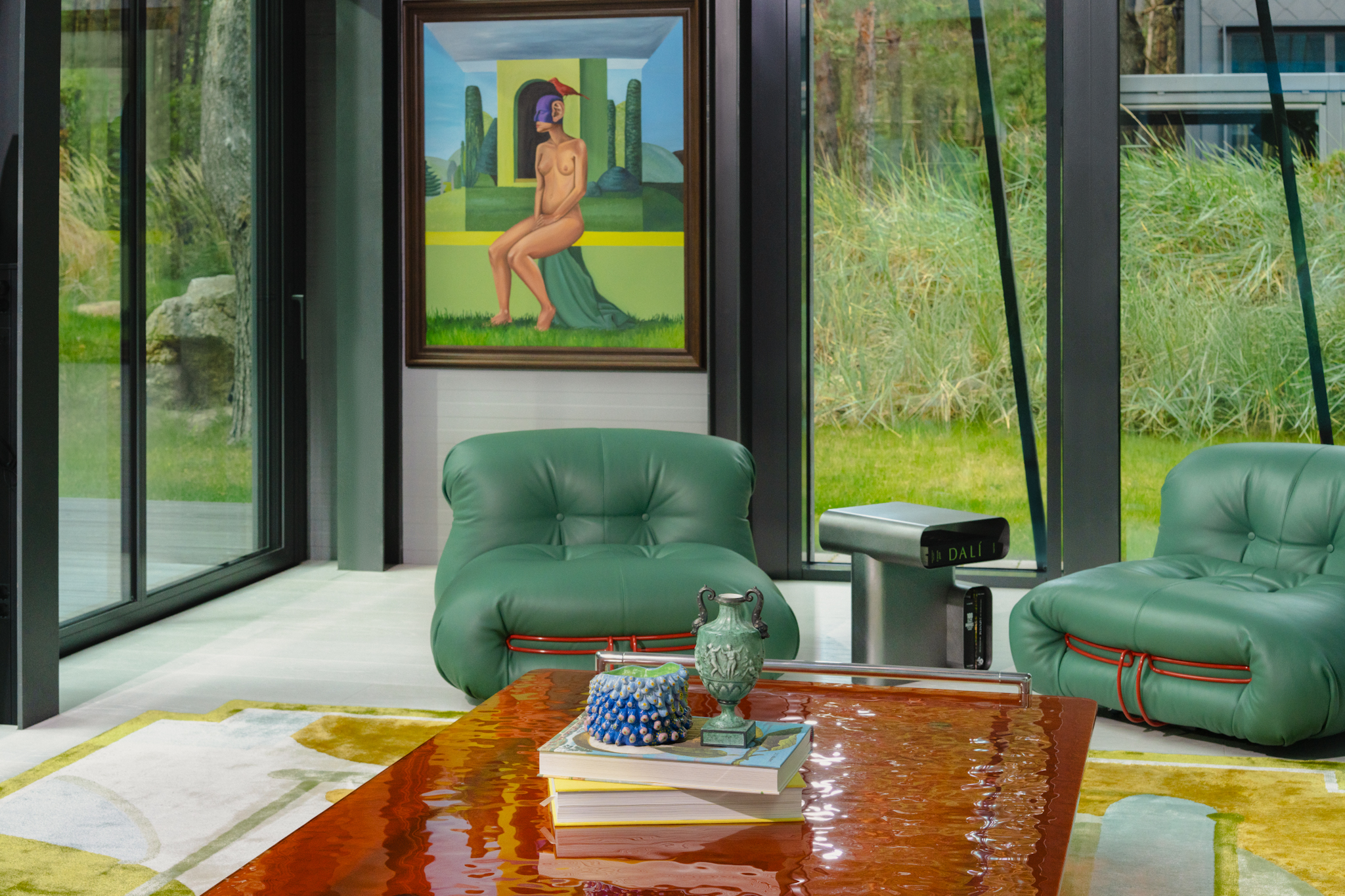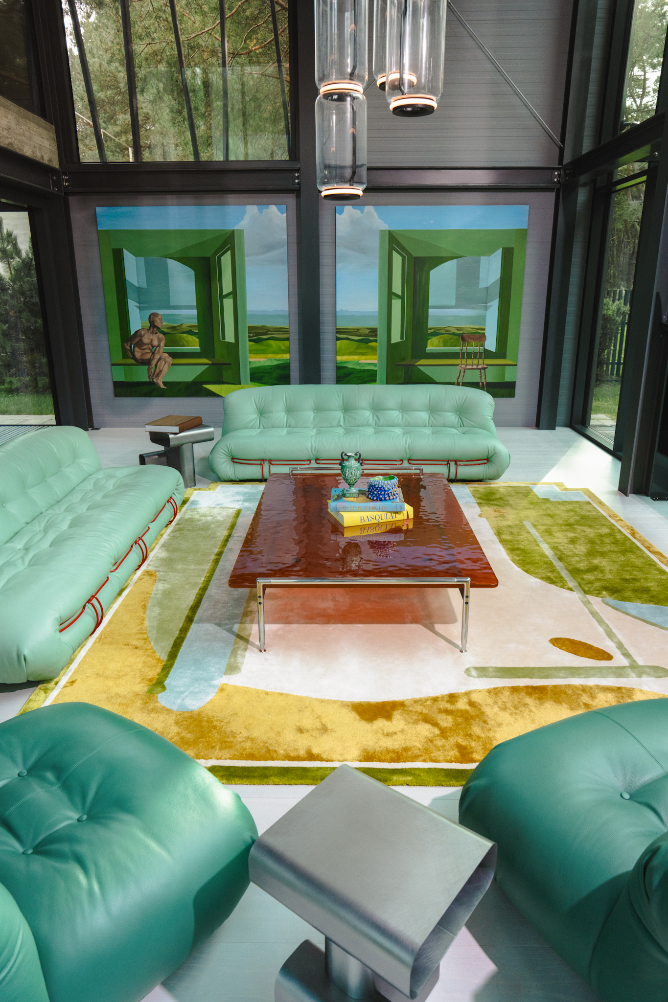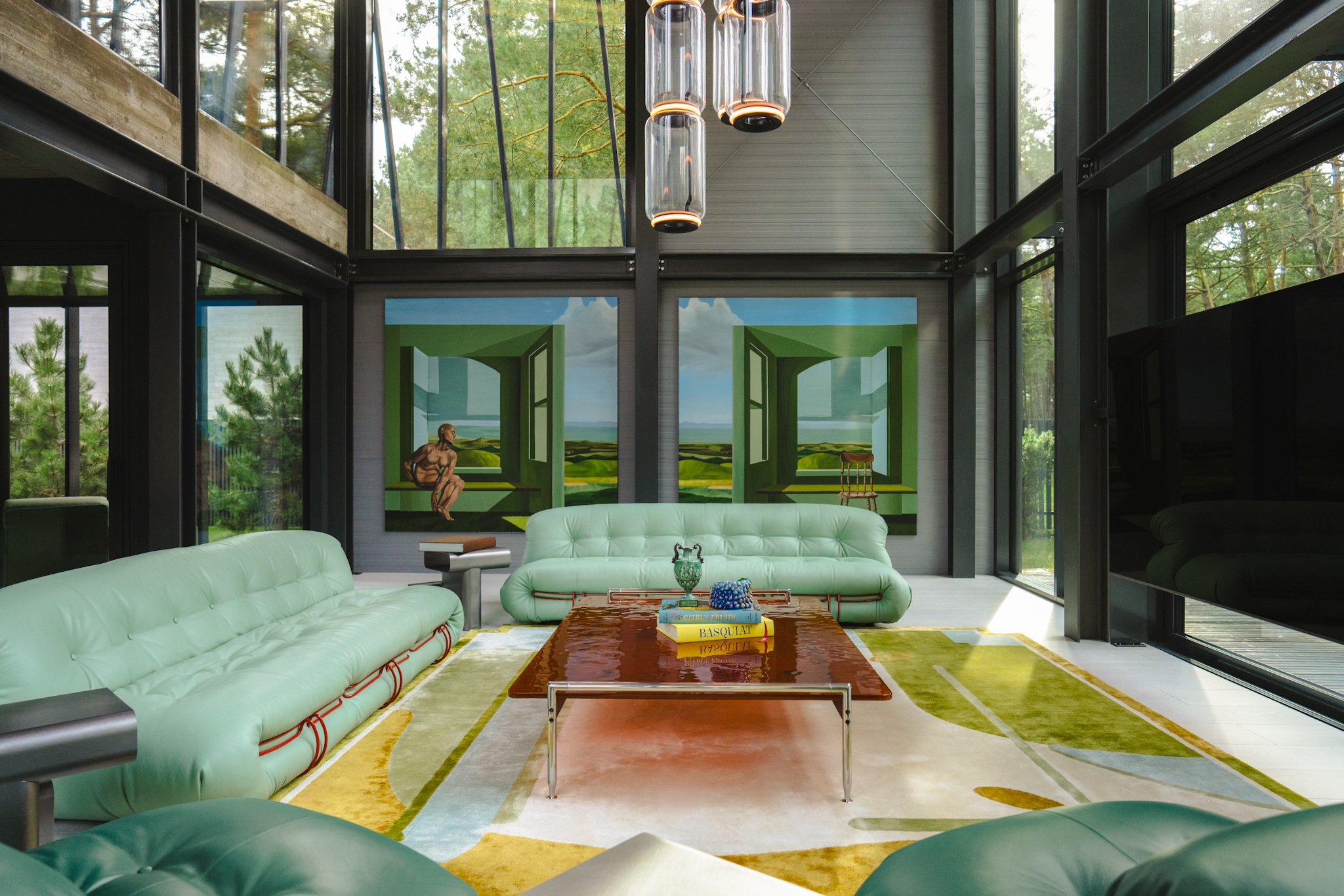 In the living space, two large-scale paintings function as architectural apertures, opening the horizon and visually merging the interior with the surrounding forest landscape. Set within a brutalist environment of metal, concrete, and modern structural clarity, the interior resolves into a cohesive composition — an inhabitable expression of the Bajoras universe within contemporary architectural form.