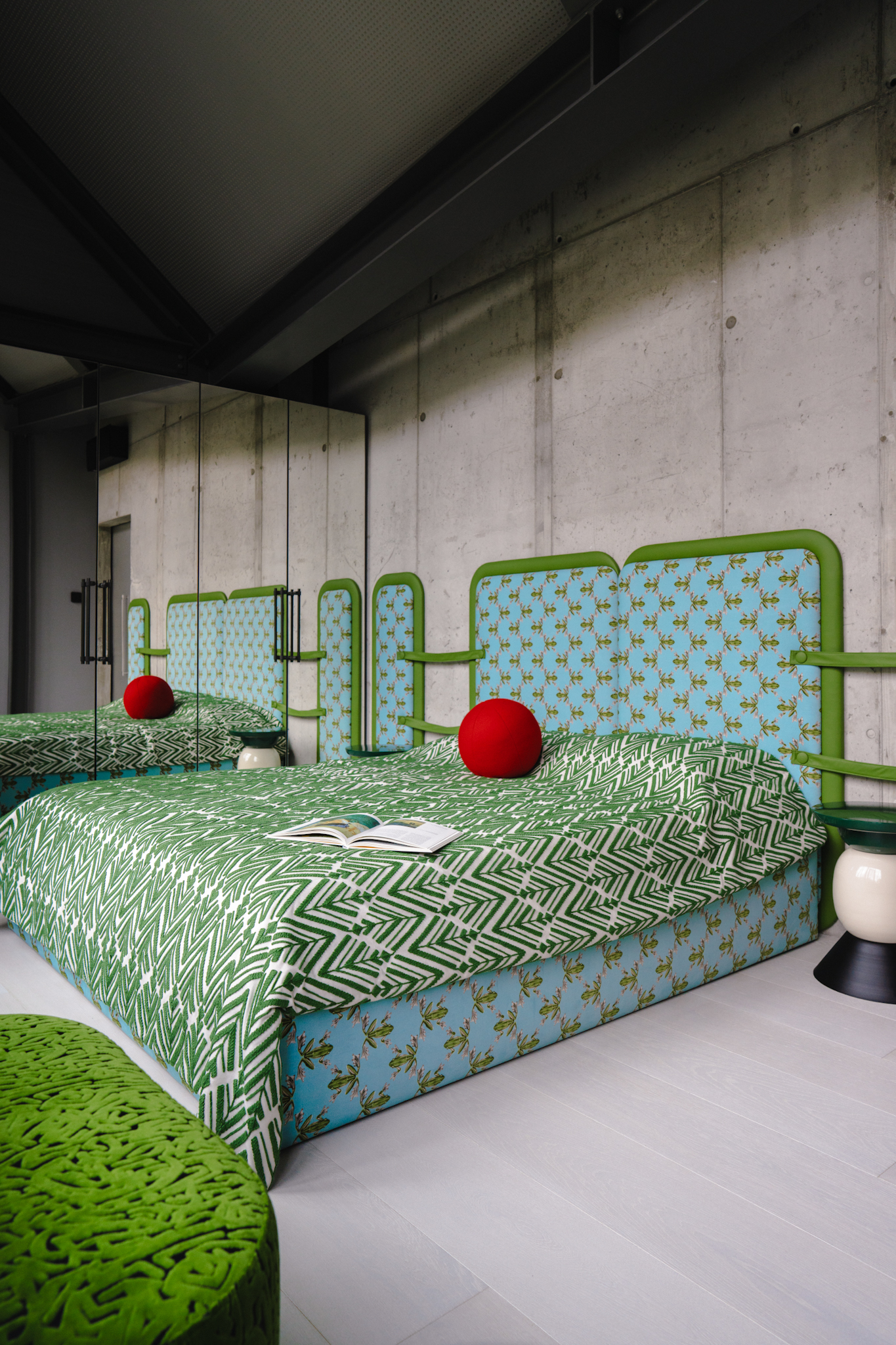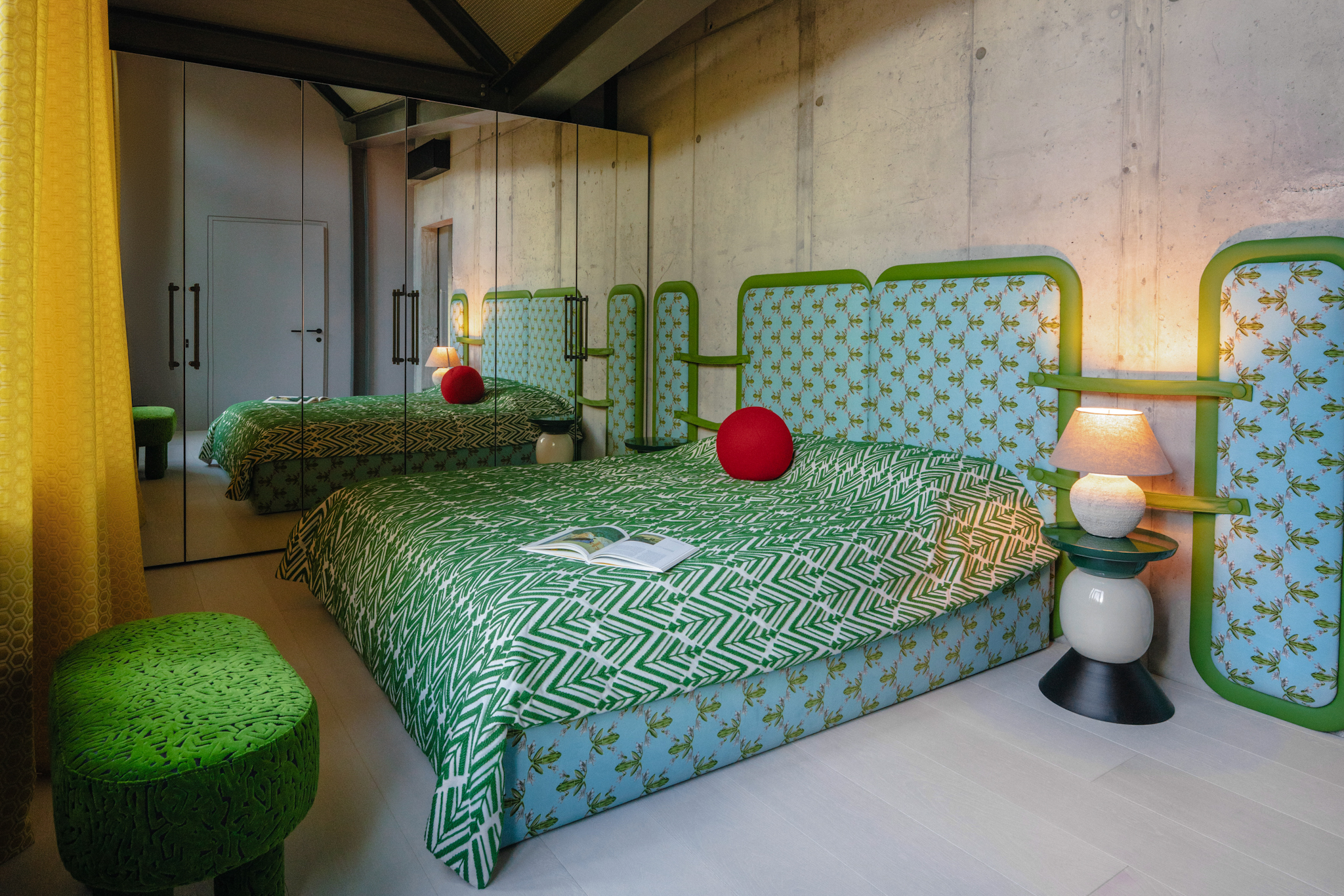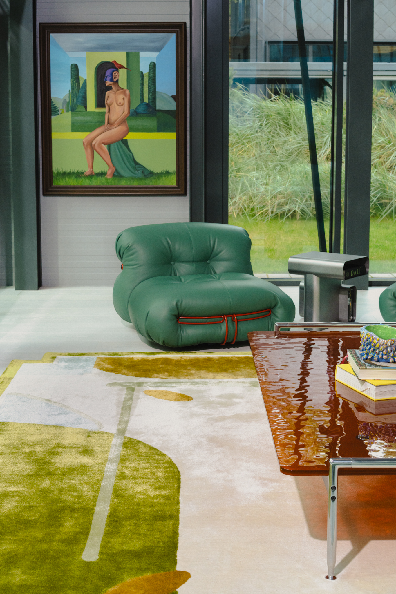 In the living space, two large-scale paintings function as architectural apertures, opening the horizon and visually merging the interior with the surrounding forest landscape. Set within a brutalist environment of metal, concrete, and modern structural clarity, the interior resolves into a cohesive composition — an inhabitable expression of the Bajoras universe within contemporary architectural form.