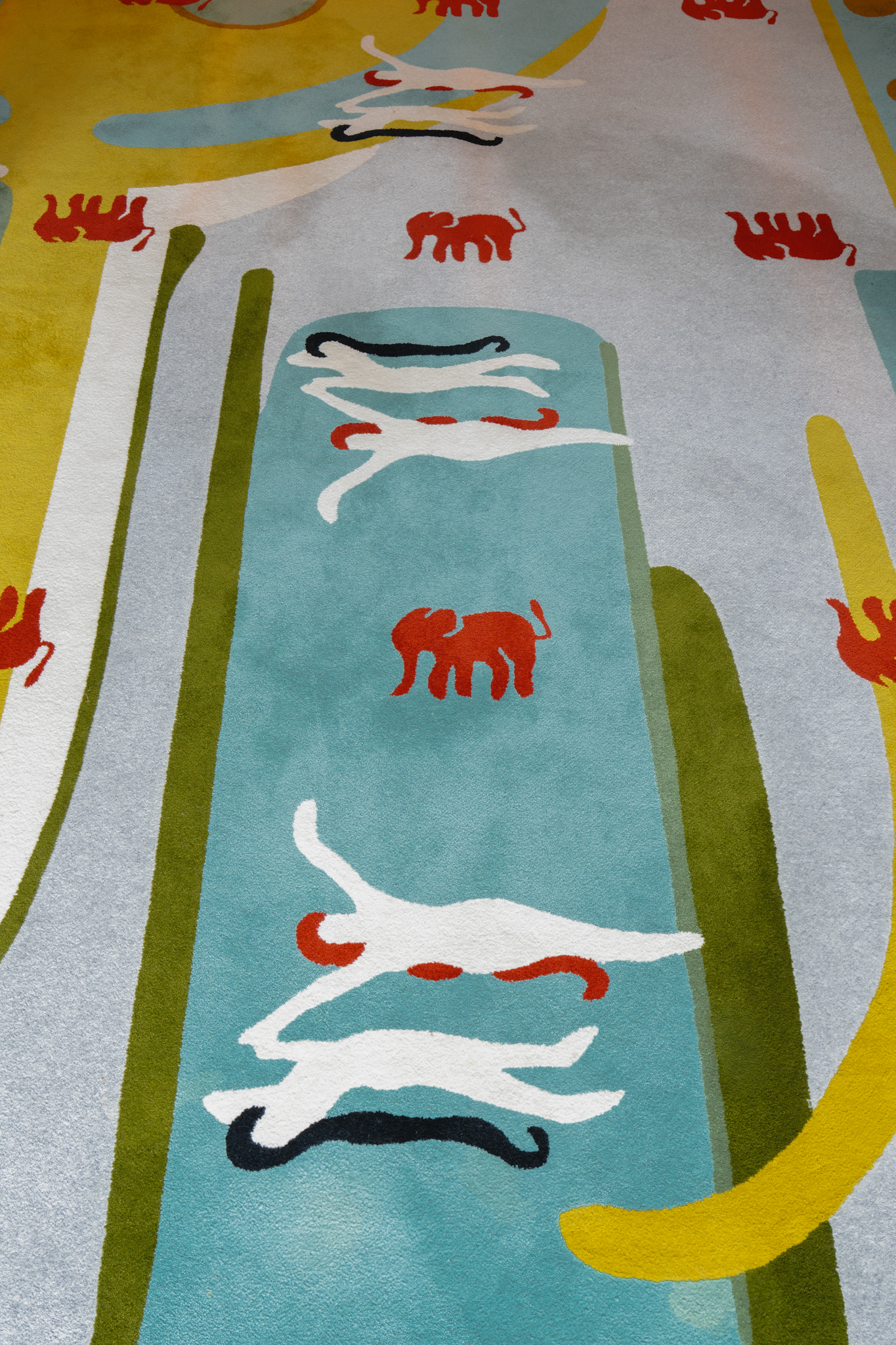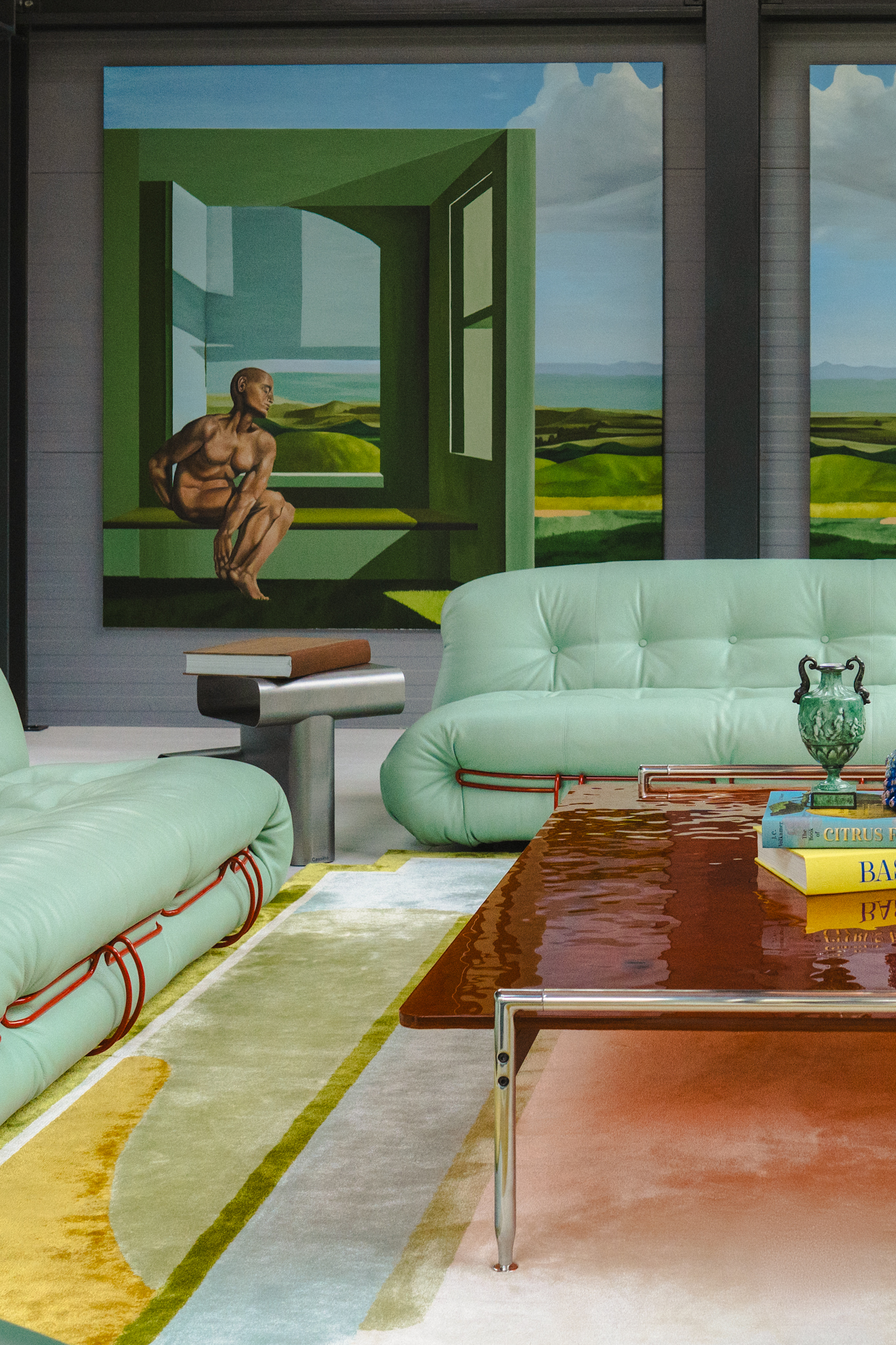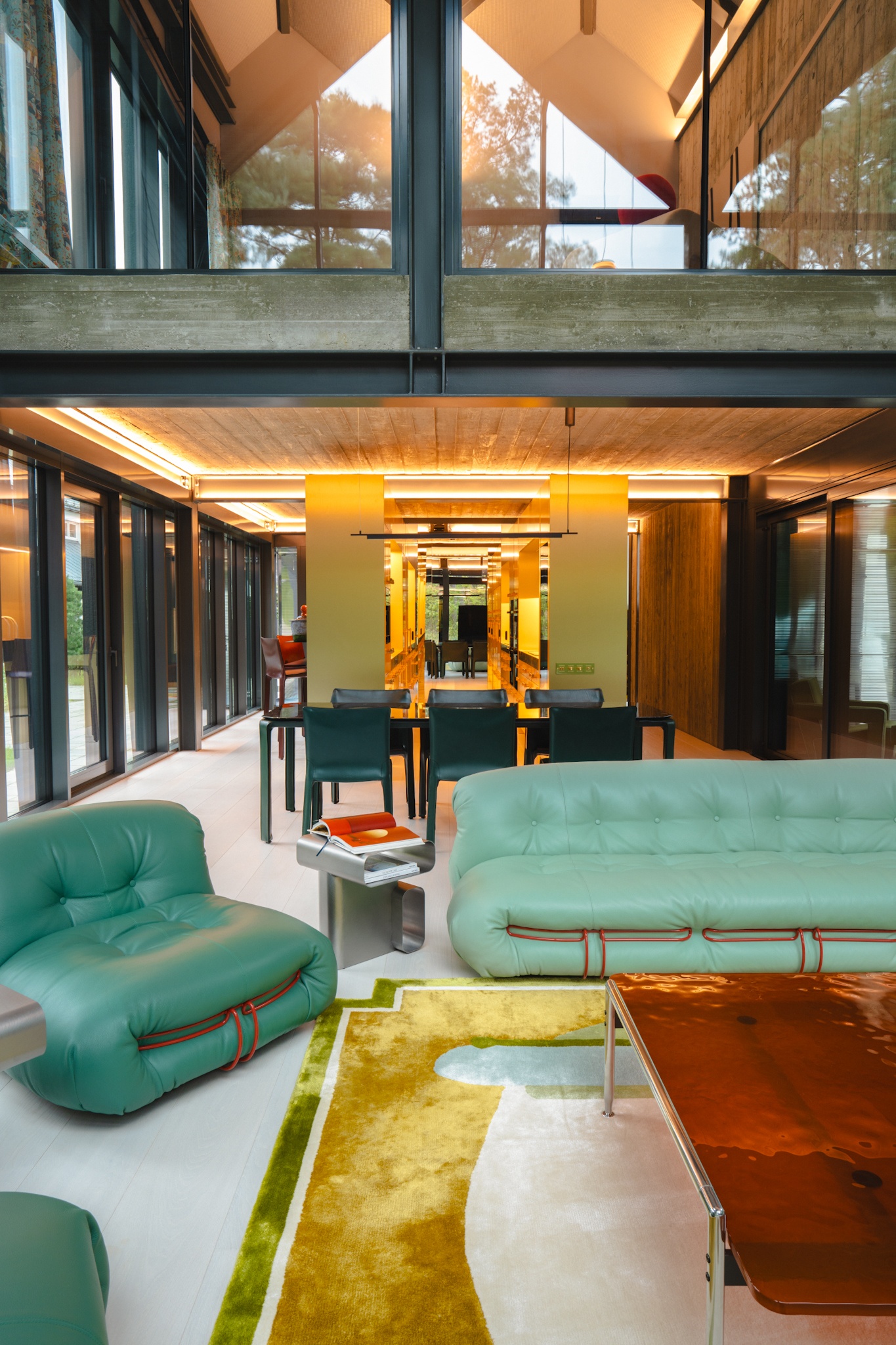 Through Bajoras’ spatial alchemy, the interior is shaped by bespoke furniture, two custom-designed rugs, and original paintings created specifically for this house. Select furniture pieces by Afra & Tobia Scarpa and Antonio Citterio introduce a layer of timeless design, grounding the space without defining it. One rug anchors the living room, while a second extends through the entrance and stairway, unifying the interior across levels.